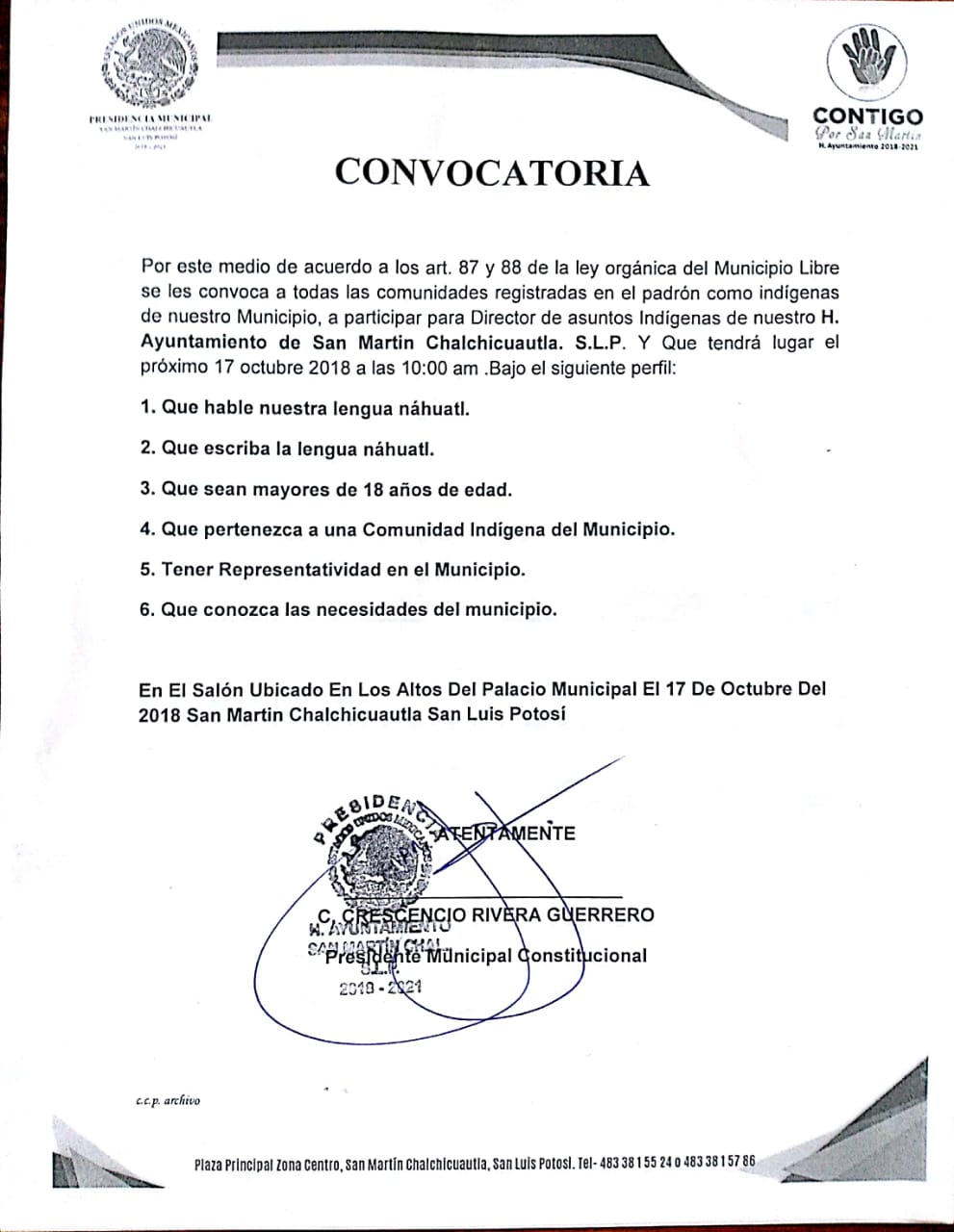 El día de hoy el municipio de San Martín Chalchicuautla da a conocer la convocatoria para participar por el cargo de Director de asuntos indígenas de este ayuntamiento en base a los siguientes lineamientos.