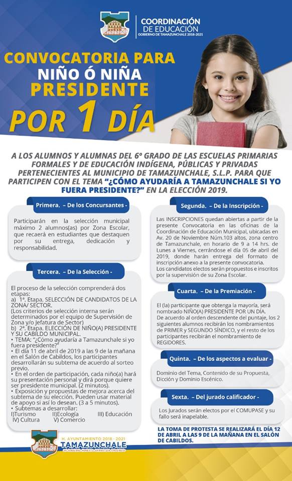 El Honorable Ayuntamiento de Tamazunchale a través de la coordinación de Educación, lanzó la convocatoria para ser niño o niña presidente por 1 día, donde los ganadores tendrán la oportunidad de ser parte de las actividades del gobierno municipal durante un día.