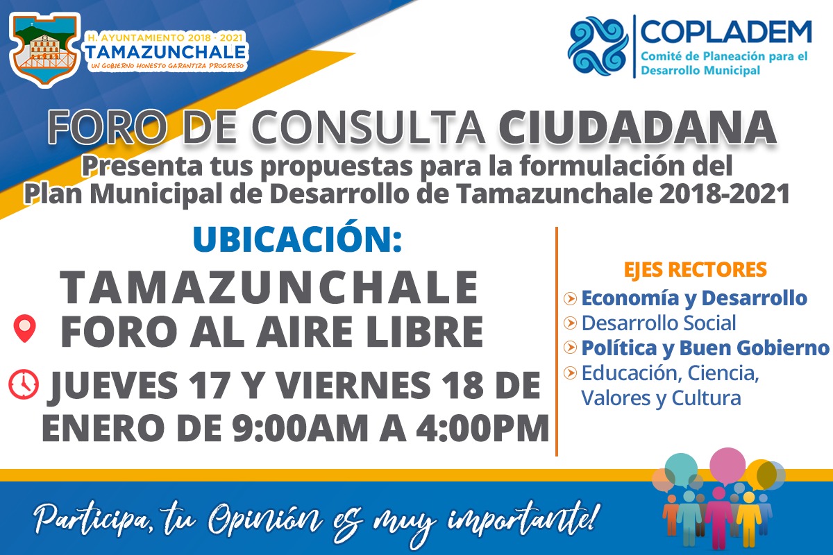 El H. Ayuntamiento de Tamazunchale, que preside el Arq. Juan Antonio Costa Medina, invita a la ciudadanía en general a participar con propuestas a través de los buzones de consulta ciudadana, que se instalarán en el foro al aire libre del Jardín Juárez.