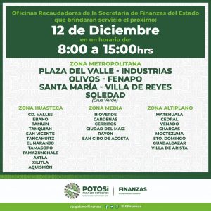 En las zonas Huasteca, Media y Altiplano, el total de las Oficinas Recaudadoras darán servicio regular ese día festivo. La ciudadanía podrá acudir de manera presencial sin necesidad de obtener una cita.