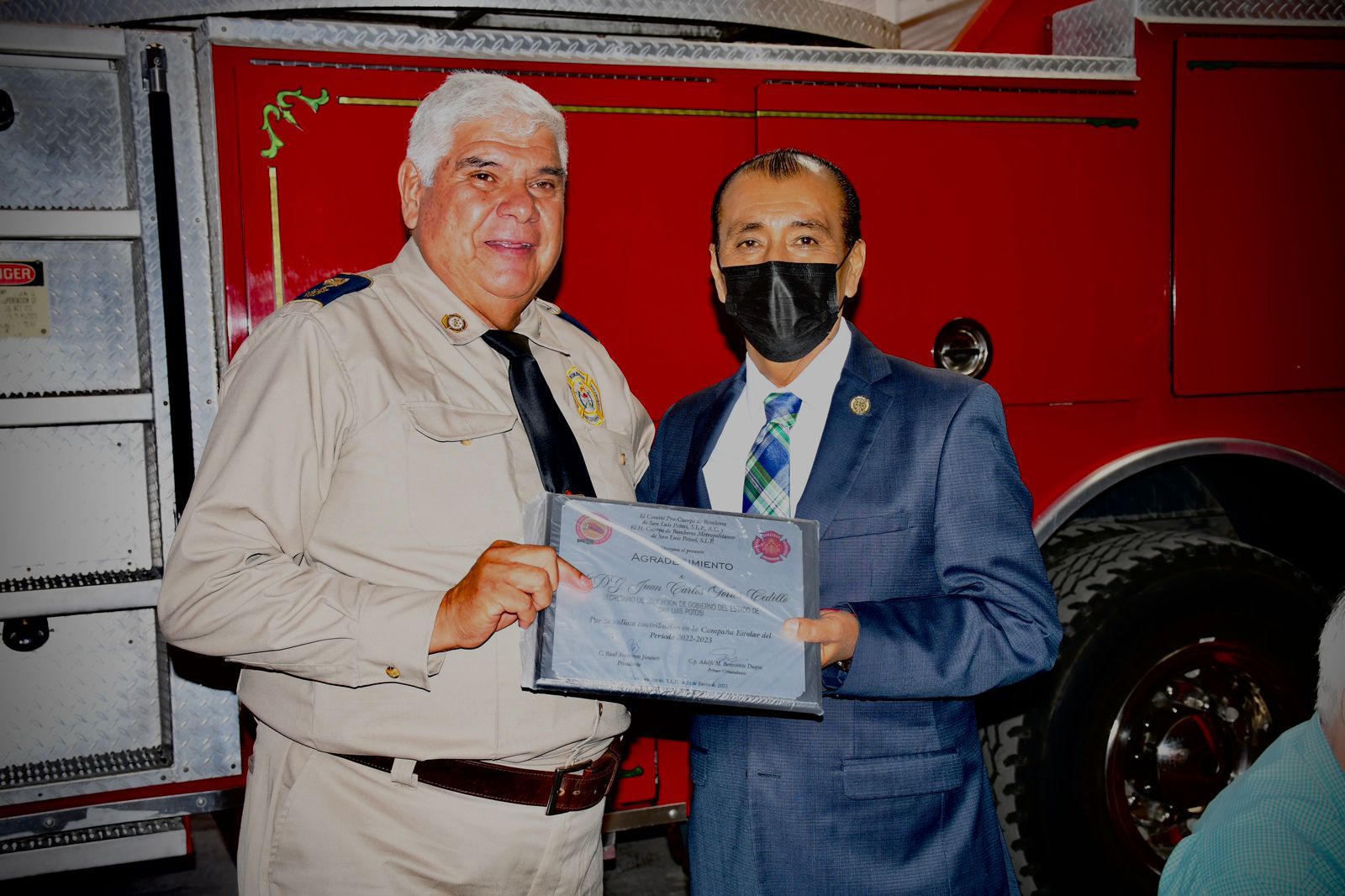 Finalmente, el comandante Adolfo Benavente Duque, reconoció el apoyo del Gobierno del Estado y entregó un reconocimiento a la SEGE por su colaboración, ya que, a través de una cuota de recuperación de una bolsita de dulces con valor de ocho pesos, las familias potosinas aportarán un granito de arena para la operación del Cuerpo de Bomberos, en las ocho estaciones que prestan 300 auxilios mensuales, sumando más de tres mil 200 auxilios en lo que va de este año.