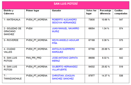 San Luis Potosí, SLP.- El Consejo Local y los Consejos Distritales del Instituto Nacional Electoral en San Luis Potosí han concluido sus sesiones permanentes de cómputo y se han entregado las constancias de mayoría a los siete diputados federales electos.