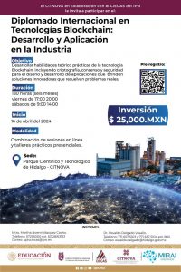 El diplomado que realiza el Citnova en colaboración con el Centro de Investigaciones Económicas, Administrativas y Sociales (CIECAS) del IPN, y MIRAI Innovation Research Institute, tiene como objetivo desarrollar habilidades teórico prácticas de la Tecnología Blockchain, incluyendo criptografía, consenso y seguridad para el diseño y desarrollo de aplicaciones que brinden soluciones innovadoras a problemas reales en contextos empresariales e industriales.