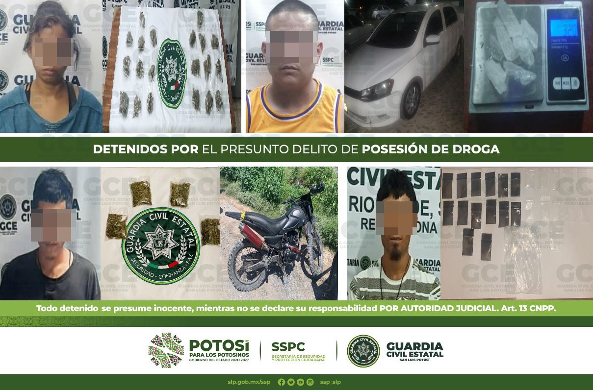 • Las detenciones se derivaron de los dispositivos de vigilancia y presencia policiaca en la zona metropolitana y los municipios de Matehuala y Cerritos.