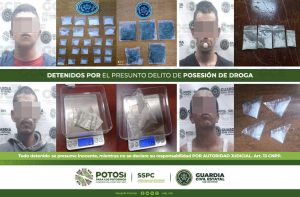 S.L.P.- Con el objetivo de preservar la paz pública en las cuatro regiones del Estado y combatir el delito de narcomenudeo, agentes de la Guardia Civil Estatal (GCE) aseguraron 67 dosis de estupefacientes y detuvieron de 11 personas por presunta posesión de droga.