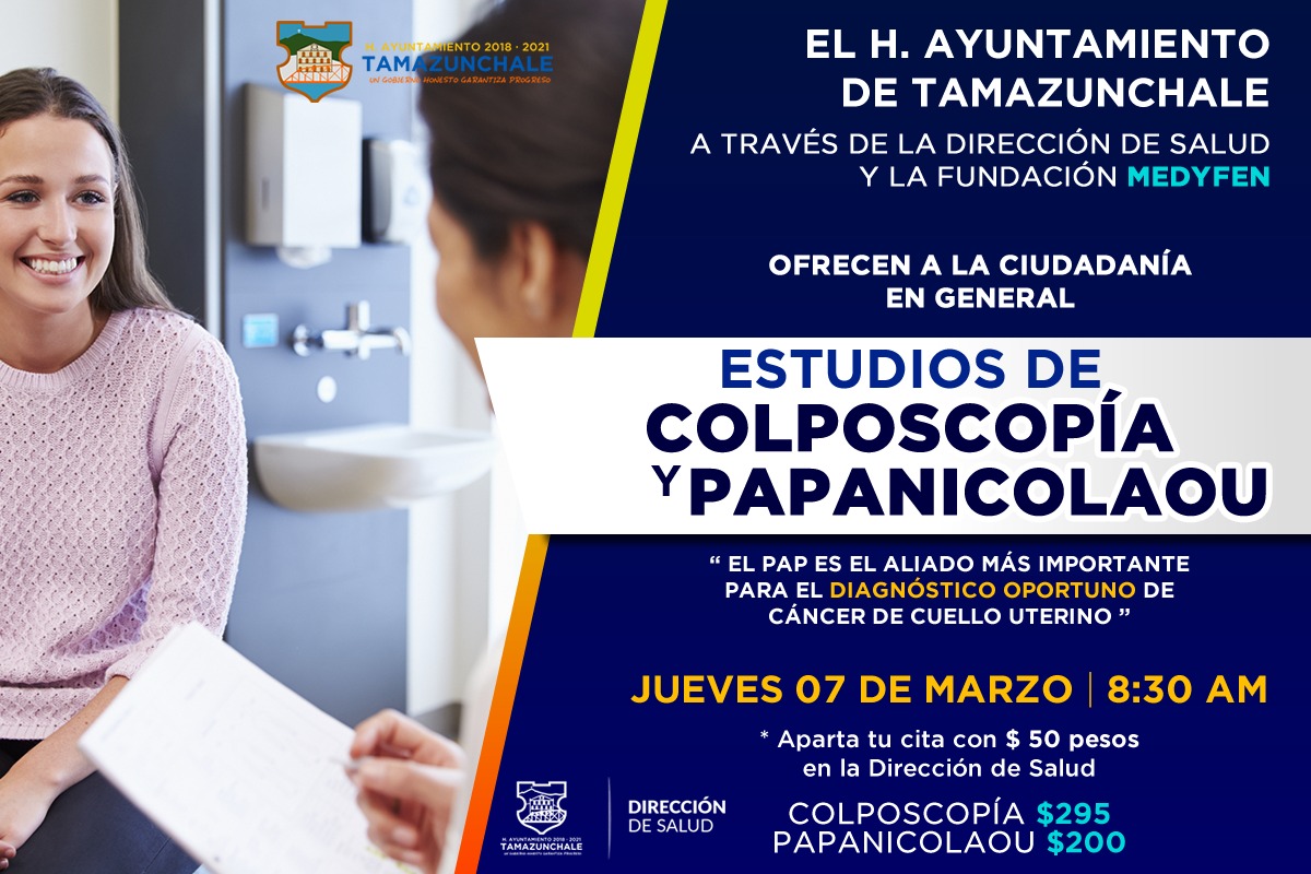 El programa de estudios de colposcopía y papanicolaou que brinda el Honorable Ayuntamiento de Tamazunchale a través de la Dirección de Salud del Municipio, en coordinación con la fundación MEDYFEN; el cual se realizará el próximo jueves 7 de marzo de 2019 a partir de las 8:30 am. en las instalaciones del la Dirección de Salud, ubicadas en el barrio del carmen.