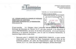 La pasada administración municipal de Tamuín, a cargo de Grecia Esmeralda Sánchez González, no dejó rastro de una partida federal de 36 millones de pesos, lo cual fue observado por la Auditoría Superior de la Federación (ASF) y por la cual hay una denuncia penal en contra de quien resulte responsable de los delitos de robo equiparado y ejercicio ilícito de funciones públicas.