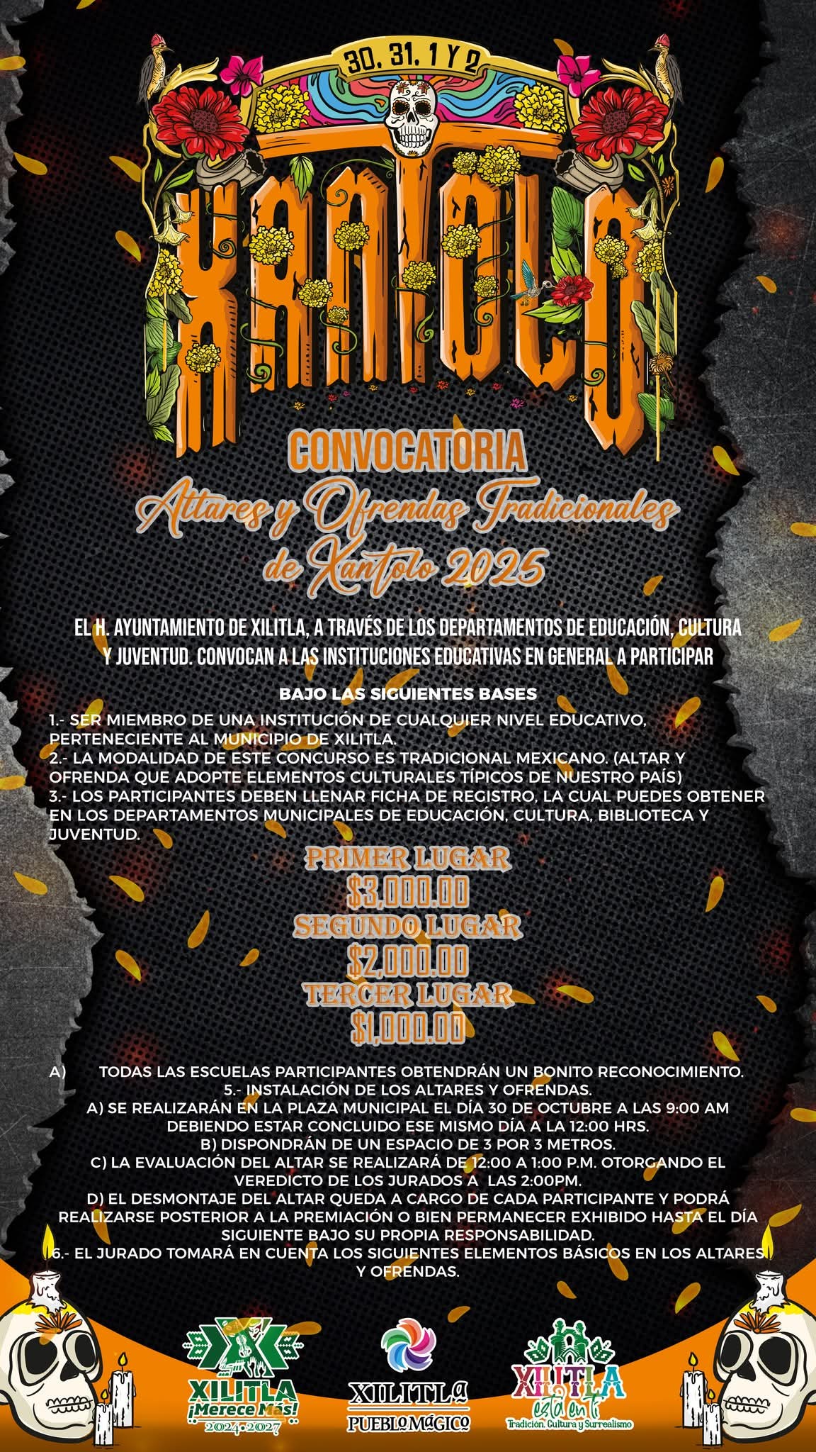 El H. Ayuntamiento de Xilitla invita a todas las instituciones educativas, barrios, comunidades y familias a formar parte del tradicional Concurso de Altares, dentro del marco de la gran celebración de XANTOLO 2025.