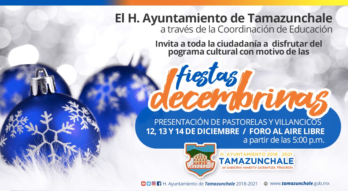 El H. Ayuntamiento de Tamazunchale, que dirige el Arq. Juan Antonio Costa Medina, a través de la coordinación de educación hacen la invitación a la ciudadanía a disfrutar del programa cultural con motivo de las fiestas decembrinas.