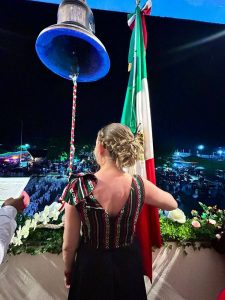Acompañada del secretario del ayuntamiento y los regidores municipales, quienes la respaldaron en este acto solemne y festivo, y también de su familia, la Presidenta Municipal dio el tradicional grito con gran entusiasmo, evocando los nombres de los héroes de la Independencia de México.