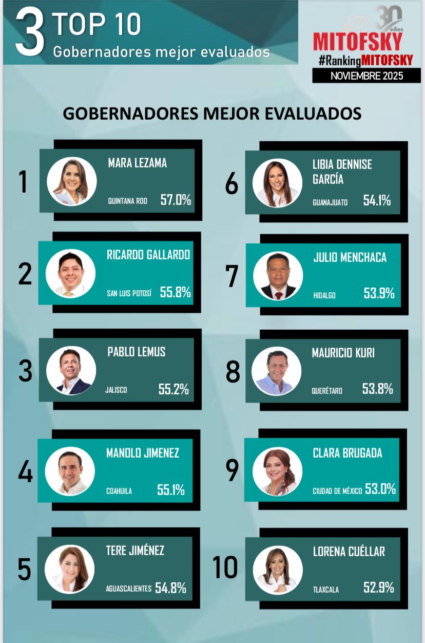 El Gobernador de San Luis Potosí, Ricardo Gallardo Cardona, se mantiene en los primeros lugares del ranking nacional de aceptación ciudadana elaborado por Consulta Mitosfky y en la evaluación del mes de noviembre subió su puntaje con respecto al mes anterior para colocarse en el segundo lugar con 55.8 puntos porcentuales.