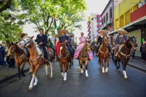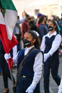 El desfile comenzó en la esquina del Eje Vial y Los Bravo, donde el joven Mandatario celebró la vuelta de actos cívicos de importancia para las y los mexicanos y felicitó a las y los participantes por sumarse a este evento que fraterniza a los distintos sectores de la sociedad. Enseguida, Gallardo Cardona se montó a su caballo y comenzó el desfile, avanzando por la calle de Álvaro Obregón hasta llegar a la Plaza de los Fundadores, donde, bajo la Bandera monumental de México, presidió el colorido y sonoro desfile junto a la presidenta del DIF Ruth González Silva; el General de Brigada