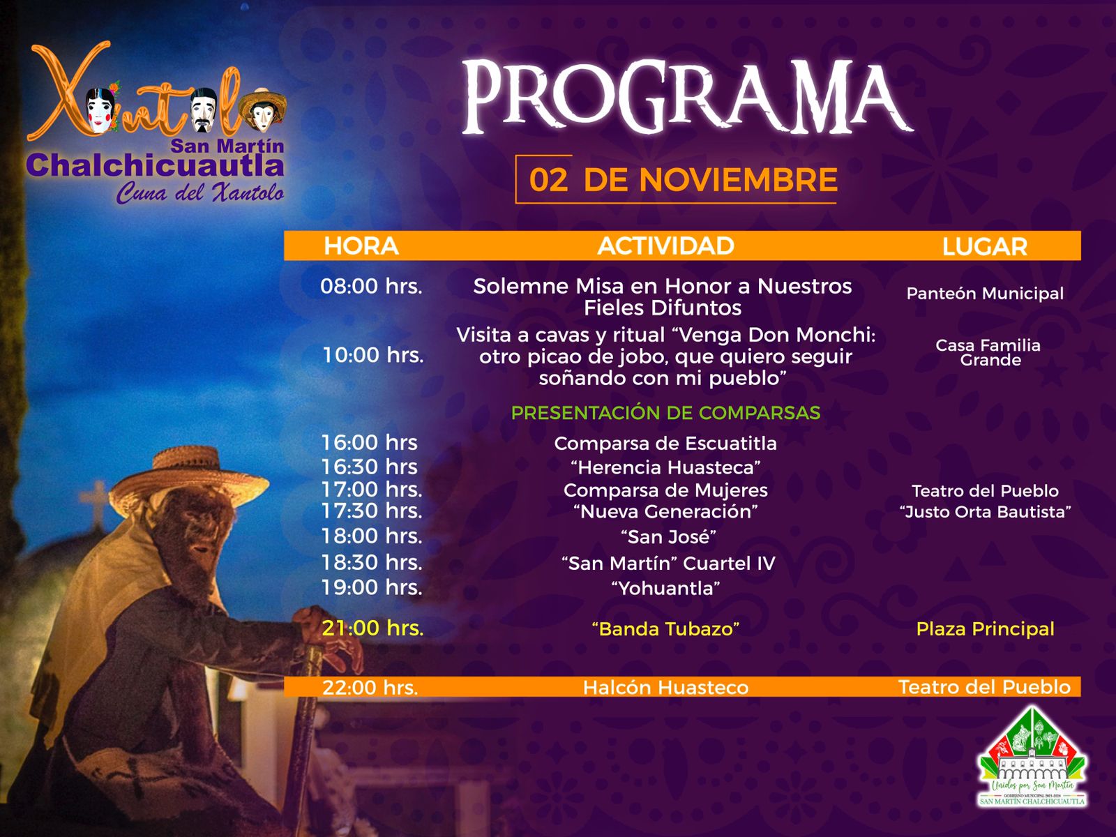 El programa incluye, exposiciones de máscaras Xantoleras, presentaciones de comparsas, actuaciones musicales, visitas al panteón entre otras actividades.