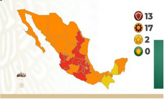 La Secretaría de Salud informó que 13 estados se ubican en semáforo rojo, 17 en naranja, dos en amarillo y ninguno en verde.
