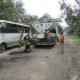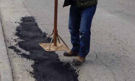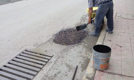 Personal de la dirección de Obras Pública, llevan a cabo los trabajos de bacheo en una de las principales calles así como...