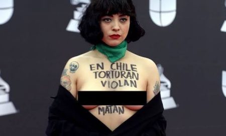 MON LAFERTE HIZO ACTO DE PROTESTA EN LA ALFOMBRA DE LOS LATIN GRAMMY AL MOSTRAR SUS PECHOS CON LA LEYENDA: «EN CHILE TORTURAN, VIOLAN Y MATAN»