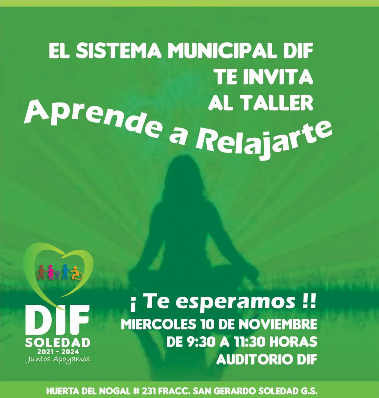 Soledad de Graciano Sánchez, SLP.- “Aprende a Relajarte” es el nombre del taller organizado por la directora del Sistema Municipal DIF, María del Pilar Cardona Reyna, el cual se realizará el próximo miércoles 10 de noviembre de 9:30 a 11:30 horas.